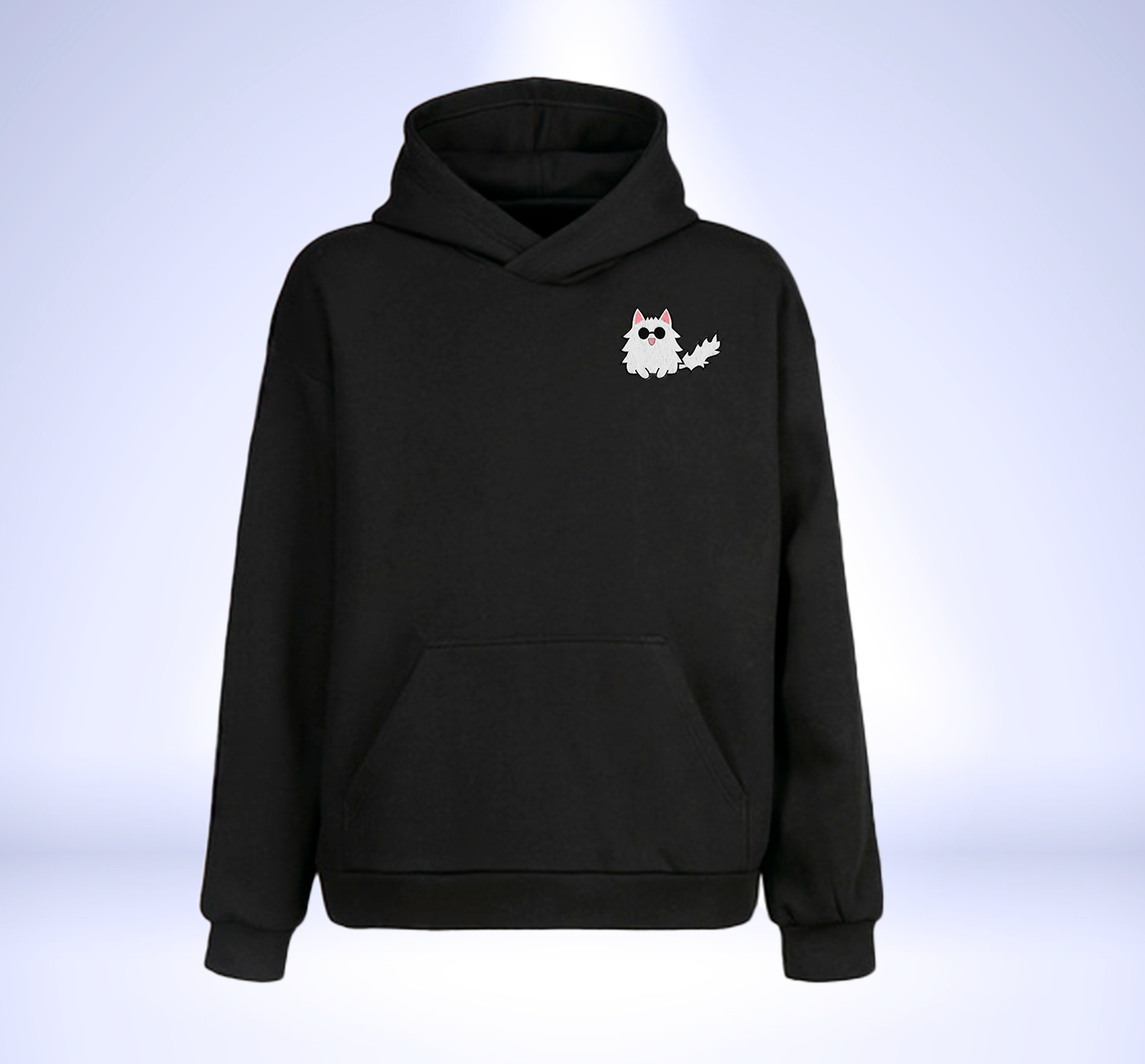 ¡Déjate envolver por el encanto y el poder del carismático Satoru Gojo, transformado en un adorable gatito, con nuestro polerón negro bordado inspirado en el popular anime Jujutsu Kaisen!