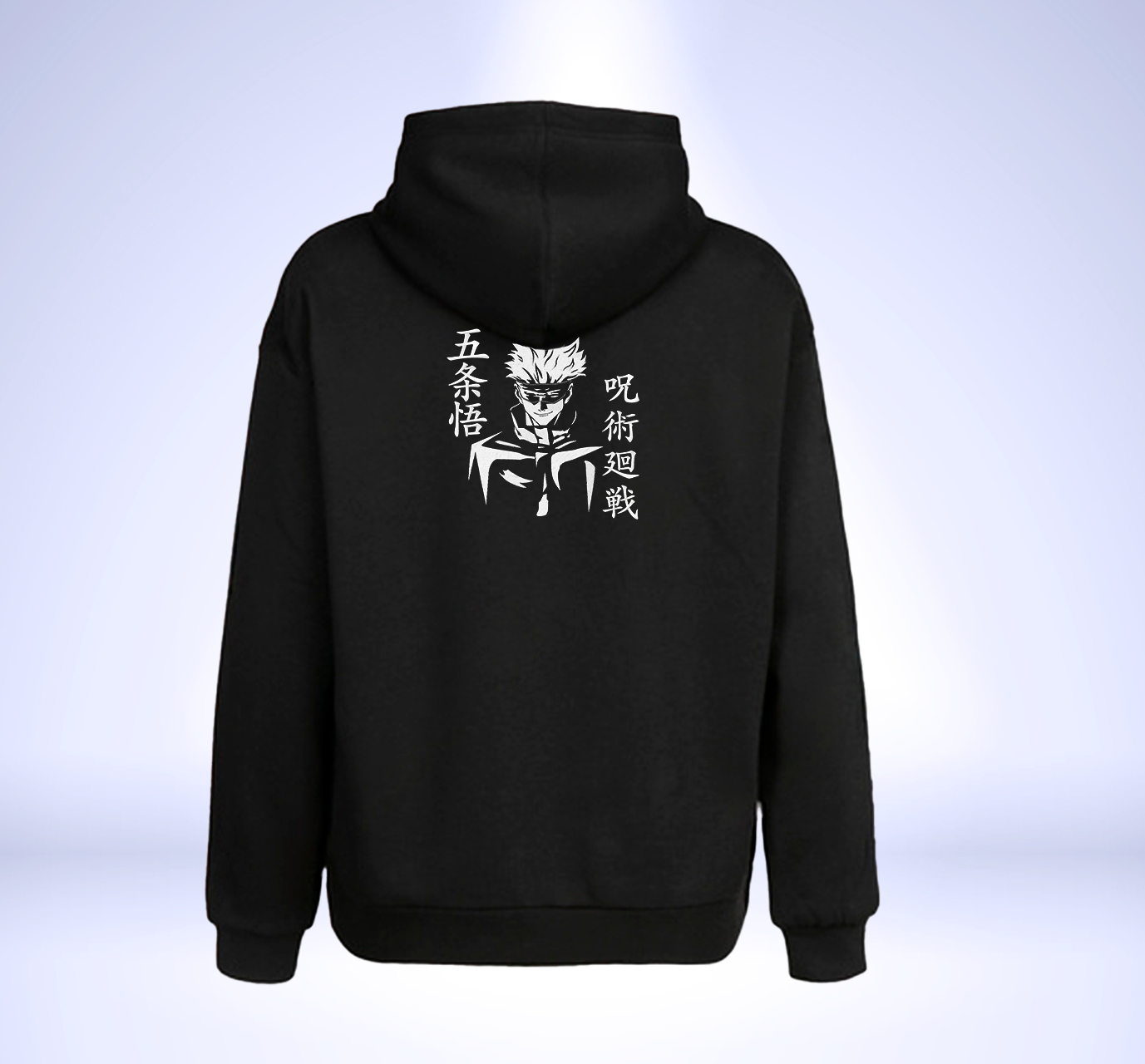 En la espalda, el polerón cuenta con un diseño en forma de silueta de Gojo, que añade un toque elegante y misterioso a la prenda.